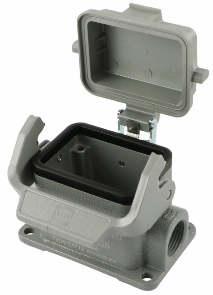 - Serie Han® B - für 6-polige Kontakteinsätze - Gehäusematerial Druckgusslegierung - mit Verriegelungsbügel - mit Kunststoffdeckel - IP 65 - für härteste Anforderungen in der Automobil- und Maschinenindustrie niedrige Bauform, 1 Kabeleingang metrisch M20