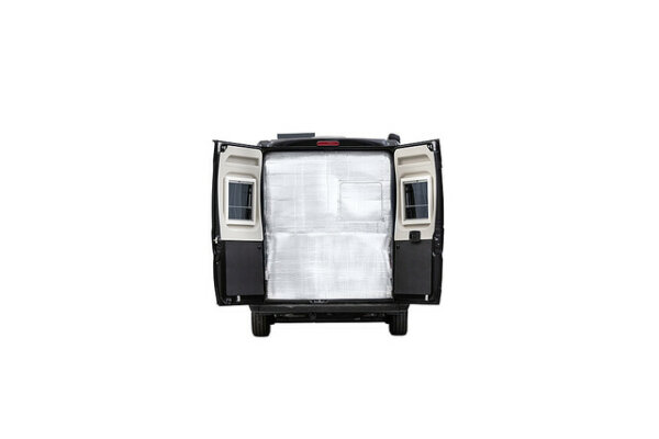 Einfach aufklappen, oben anheften: Dank der Klettverschlüsse lässt sich der untere Teil der Hecktürisolierung kurzfristig am oberen befestigen. So ist der Zugriff auf den Stauraum frei und die Wärme bleibt trotz geöffneter Hecktür in der Wohnkabine. Die Innenmontage erfolgt durch Druckknöpfe.