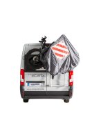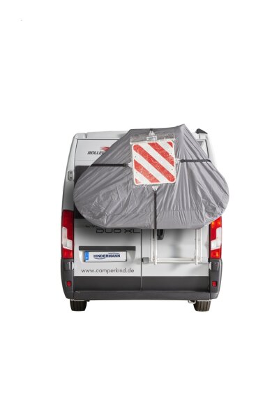 Die Schutzhülle lässt sich am Heckträger rechts am Kastenwagen anbringen. Für Reisemobile mit Fahrradträgern gilt eine empfohlene Höchstgeschwindigkeit von 90 km/h.