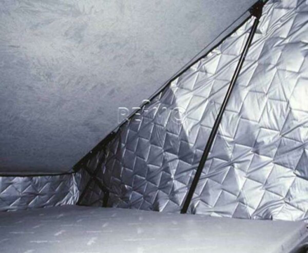 Thermomat pour toits pliants 7 plis. Isolation contre la chaleur ou le froid. Protection contre la condensation et l'humidité.Installation à l'intérieur : avec boutons-pression/bande Velcro. Isolé été comme hiver. Particulièrement adapté pour l'isolation des soufflets de tente dans le toit de couchage Reimo VW T5/6 à empattement court, le toit EasyFit peut être relevé à l'avant.