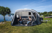 Quickly and easily erected by inflating the air hose. The tent closes accurately with the curve of the outer wall of the Adria Action. Side windows with mosquito nets and roll-up covers, front door can be rolled up or used as a sun awning. Equipped with removable floor and a windbreak against drafts.Further specifications:Material: 190T polyester (seams versigelt)UV protectionFlame resistant