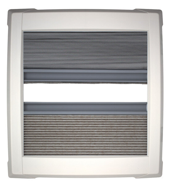 Retrofit set for MPK roof hoods 28x28cm: Blackout and fly screen net pleated with permanent ventilation through frame. Frame colour white. Technical data: continuous ventilation 75cm², frame dimensions: 365x340x32mm