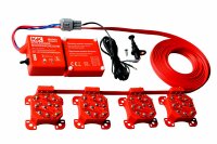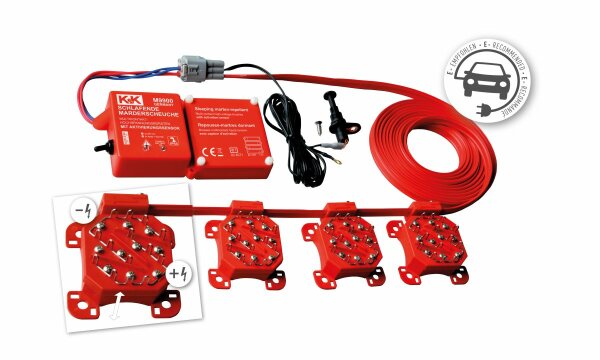 Batterien nicht im Lieferumfang! Das SCHLAFENDE Marderabwehrgerät Das autarke Marderabwehrgerät M9900 von K&K profiliert sich durch den integrierten Schlafmodus der Aktivierungssensoren, welcher die AA-Batterien nur bei Kontakt in Anspruch nimmt und die restliche Zeit „schlummert“. Streift der Marder an der Multikontakt Hochspannungsbürste vorbei, wird die Hochspannung im Bruchteil einer Sekunde ausgelöst. Dies ermöglicht einen äusserst effizienten, aber auch extrem geringen Energieverbrauch. Die Laufzeit der Batterien sowie die Abwehrfunktion ist somit quasi unbegrenzt*. Eine Low-Battery-Anzeige mit LED weist zudem frühzeitig auf ein “natürliches“ altersbedingtes Ende der Batterielaufzeit hin. Hochspannungsabwehr ist gerade bei besonders aggressiven Tieren im Revierkampf und „Veteranen“ mit veränderter Hörschwelle unumgänglich. Als besonders effektiv haben sich hierbei die felldurchdringenden K&K +/- Hochspannungsbürsten bewährt, weshalb sie auch beim M9900 in 4-facher Ausführung zum Einsatz kommen. Im Gegensatz zu herkömmlichen Kontaktplatten kämmen die Edelstahlbürsten durch das Fell und so bieten nicht nur Pfote und Schnauze eine Angriffsfläche, sondern der gesamte Körper des Eindringlings. Aufgrund der wasserdicht vergossenen Elektronik, kann das Gerät besonders tief im Motorraum angebracht werden und agiert somit als „Türsteher“ für den besonders schutzwürdigen Eintrittsbereich des Marders. Die flexibel verschiebsowie erweiterbaren Edelstahlbürsten ermöglichen zudem eine optimale Anpassung an den jeweiligen Motorraum. Wird die Motorhaube geöffnet führt der Sicherheits-Motorhaubenschalter zu einem sofortigen Abbau der Hochspannung an den Kontaktplatten und ermöglicht somit ein gefahrloses Arbeiten. Selbstverständlich erfüllt auch diese Innovation die strengen OEM Anforderungen. *entspricht Lagerungsdauer der Batterie, in welcher die Batterie als Energiespeicher ohne Leistungseinbussen eingesetzt werden kann. TECHNISCHE DATEN: • Betriebsspannung: 6 V, 4 AA Batterien • Batterielaufzeit: ca. Haltbarkeitsdatum der Batterien • Impulsbereich: > 250 V • Temperaturbereich: ca. -25°C bis +80°C • Masse Steuergerät: ca. 86 x 55 x 50 mm • Kabellänge Hochspannungskabel: ca. 4 m • Multikontakt-Hochspannungsbürsten mit Plus- und Minussträngen: 4 Stück verschiebbare Hochspannungsbürsten • Auch für Fahrzeuge mit CAN Busgeeignet. Automatische Reduzierung der Stromaufnahme, bei Kurzschlussoder Verschmutzung (Blindströme) an den Hochspannungsbürsten. Kompaktstecker am Steuergerät zum einfachen Abtrennen des Steuergerätes von der Kabelinstallation Zulassung mit E1 Zeichen. Wasserdicht IP65, Schlafmodus, Batterie 4 x AA, > 250 V