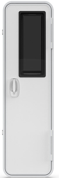 Normgeprüfte Tür für Reisemobile zugelassen. Türrahmen und Türblatt aus Aluminium, Eckradien 89mm, für Wandstärken 31-33mm, Türanschlag von außen gesehen rechts. Integriertes E1-Fenster in Trapezform. HSC-II-Schließzylinder. ABS-Innenschale. Gewicht 22kg