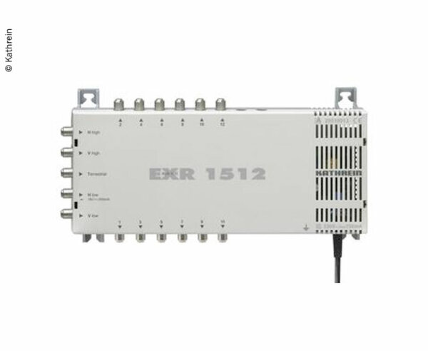 EXR 1512 Multischalter 5 auf 12 Multischalter 5 auf 12, 47-862/4 x 950-2150 MHz, F-Anschlüsse, integriertes Netzteil: 18 V/550 mA, Anschlussdämpfung: SAT 12-7 dB/Terr. 8-4 dB, Entkopplung: H/V 25 dB, Ausg/Ausg 25 dB, Steuerung: V/H 11-14,5/16-19 V, Low/High 0/22 kHz Mit integriertem Verstärker für geringe Anschlussdämpfungen im Sat- und terrestrischen BereichPreemphase zum Entzerren der Kabeldämpfung integriertHohe Entkopplung zwischen den AusgängenLNB-Fernspeisemöglichkeit über den Eingang horizontal low. Alle anderen Eingänge sind spannungsfrei (dadurch Betrieb mit UAS 585 möglich).Niedrige Leistungsaufnahme durch hocheffizientes, kurzschlussfestes Schaltnetzteil und Stromsparkonzept (jeder einzelne Multischalter-Zweig wird vom angeschlossenen Receiver versorgt und mit dem Ausschalten des Receivers abgeschaltet)Für dei Innenmontage