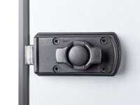 Porte de caravane pour paroi de 29mm d'épaisseur. Butée de porte (vue de l'extérieur) à droite. Angles de 83mm de rayon. Avec serrure de caravane Zadi ronde, 2 clés incluses.