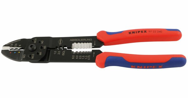 - Kabelschuhzange, für isolierte Verbinder 0.5 bis 6.0m m2. Einrollpressung unisolierte Verbinder 0.5 - 2.5 mm2 - Länge 240 mm Isolierte Kabelschuhe 0.5 - 6.0 mm2