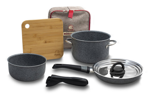 Kochgeschirrset aus Antihaft Aluminium mit abnehmbaren Griffen, Multi-Deckel aus Edelstahl, Schneidebrett aus Bambus, geeignet für Induktion, Tragetasche, Kapazität 5 Liter.
