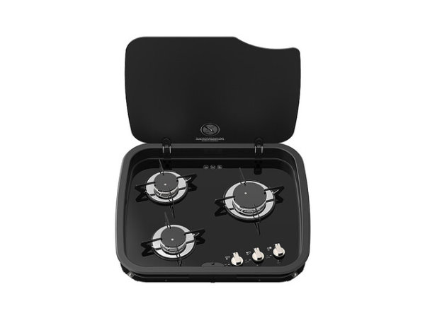 Schlichte, unterbaufähige Kochplatte für Wohnwagen und Wohnmobile, mit einer Glasabdeckung für ein modernes Aussehen.