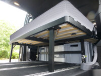 Das Bett wird in den Original-Bodenschienen mit Schnellspannern befestigt. Passt in VS20, Länge 5,14 m (Vito und V-Klasse) mit dem Sitzschienensystem. Es können zwei Einzelsitze im Fahrzeug verbleiben. Diese werden bei aufgebautem Bett ganz nach vorne geschoben und in Transportstellung gebracht.Hinweis: Die Sitze in der zweiten Sitzreihe müssen bei aufgebautem Bett ganz nach vorne geschoben und in Transportstellung gebracht werden.