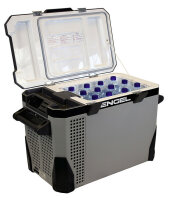 Die Kühlbox besteht aus einem robusten Kunststoffgehäuse und der bewährten ENGEL Technologie. Die praktischen Handgriffe sind abnehmbar und der Deckel kann auf beiden Längsseiten angeschlagen