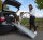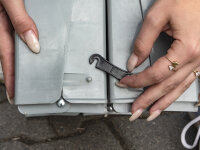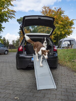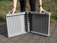 Seitliche Sicherheitsränder, Rillenprofil für sicheren Halt. Faltbar, mit Tragegriff und Sicherungshaken.