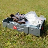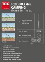Geliefert wird das TOX Camping-Set mit 18x Tellerkopfschraube 8x160 mm (8 Stück) und 8x220 mm (10 Stück), 18x Weiße Kunststoff-Unterlegscheibe Ø35 mm, 2x Bit TX40, 1 Paar Montagehandschuhe Gr. 9 und 1x L-BOXX Mini.