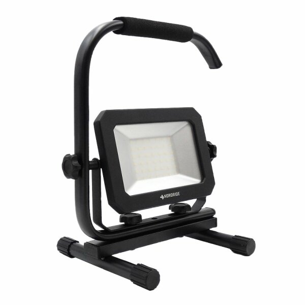 LED-Baustrahler mit Kabel auf robustem Ständer; dank seitlicher Entblendung (prismatischer Diffusor) hat der Strahler eine gleichmässige Ausleuchtung und dies in angenehmen 5'000 K (neutralweiss). • 230 V 30 W • leuchtstark mit 3’300 lm • neutralweiss 5'000 K • CRI/Ra >80 • ideal für Innen- und Aussenbeleuchtung • IP65 staubdicht und wassergeschützt • nur 1.75 kg • 3-m-Netzkabel • optional erhältliches Stativ 250 x 185 x 310 mm, 3’300 lm, neutralweiss 5'000 K, IP65