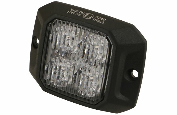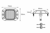 Lichtquelle: LED Lichtfarbe: Gelb Montageart: Festmontage / Aufbau Leuchten-Typ: Front-Heckwarnblitzer Spannung: 10 bis 30 Volt Stromversorgung: Festinstallation Anschluss Kabellänge: 300 mm Länge: 73 mm Breite / Tiefe: 14 mm Höhe: 55 mm Lochabstand: 64 mm Lochdurchmesser Befestigung: 4 mm Wasserdicht: Ja IP-Grad: 67 ECE-R65-Zulassung: Klasse 2 Zusatzinformation: rot = Plus (+) schwarz = Masse (-) grün = Programmierung Blitzmuster auf (+) grün = Synchronisierung (bei Synchronisierung grün mit grün, permanent verbinden) weiss = Alternierend weiss mit weiss 73 × 55 × 14 mm, 10 - 30 V, 14.5 W, IP67