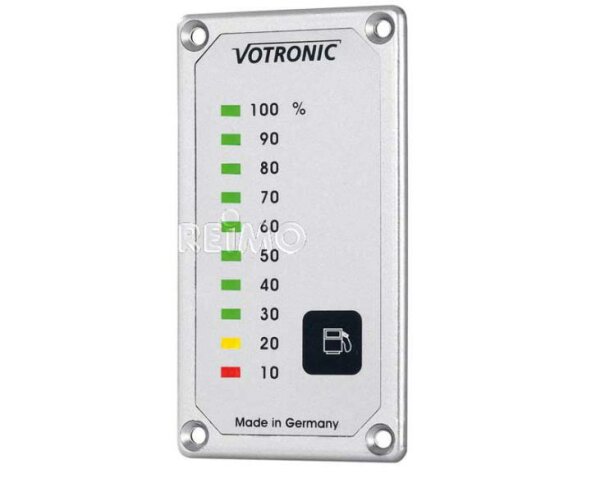 Diese VOTRONIC Tankanzeige wurde zur genauen Füllstandsmessung konzipiert und ist für alle Tankmaterialien und Tankgrößen verwendbar. Die Füllhöhe des Tanks wird als übersichtlicher Leuchtbalken mit 10 Leuchtdioden dreifarbig dargestellt, was die genaue Erfassung des Tankfüllstandes auf einen Blick gestattet. Die Anzeige erfolgt dabei sogar stufenlos, da Zwischenstände mit variabler Helligkeit dargestellt werden und somit auch Tendenzen sofort erkennbar gemacht werden. Beim Be- und Enttanken der Behälter vermittelt die stetig steigende oder fallende Anzeige das direkte Abbild des aktuellen Füllstandes. Auf Knopfdruck ist die Anzeige ein- und abschaltbar bzw. schaltet sich nach ca. 10 Minuten automatisch wieder ab. Geringe Frontplattenmaße und die besonders geringe Einbautiefe von nur 15 mm erlauben die Montage an nahezu jeder Stelle. Verwendbar z.B. mit Tanksonde 801201 (für Tankhöhen 15-35cm) oder 801203 (für Tankhöhen 20-50cm)