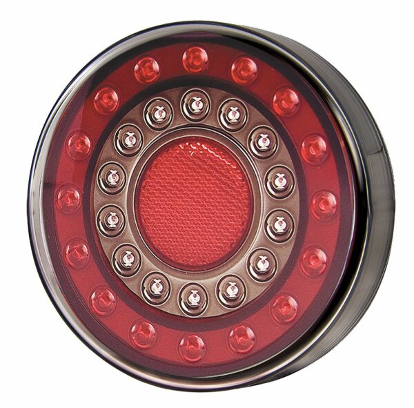 Lochabstand: 45 mm, 2 x M8 braun = Schlusslicht rot = Stop gelb = Blinker weiss = Masse IP67 Garantie 7 Jahre ø 125 x 40 mm, IP67