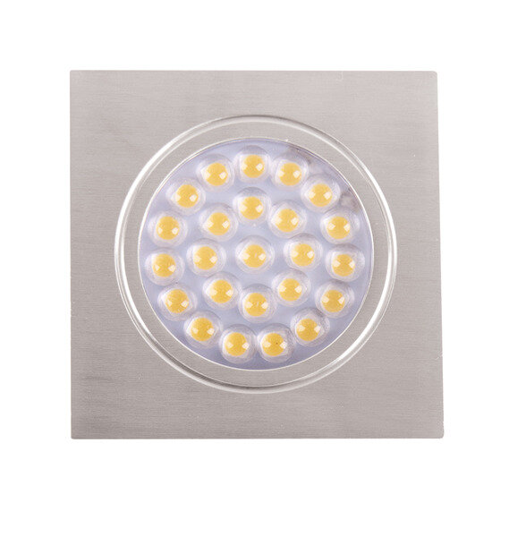 Ce spot encastré à LED est utilisé dans les véhicules Adria. 12 Volt, 1.6 W, 24 LEDs, aluminium brossé, 4000K, avec interrupteur tactile, dimensions : 65 x 65 x 20 mm, efficacité énergétique A+.
