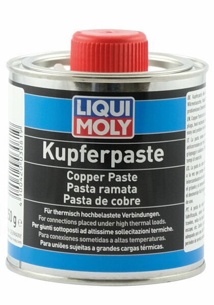 Trenn- und Schmierstoff aus feinsten Kupferpartikeln für thermisch hochbelastete Maschinenelemente. Zum Schmieren und als Korrosionsschutz für thermisch hochbelastete Verbindungen. Ermöglicht eine problemlose Demontage nach langer Betriebszeit. Chemische und petrochemische Industrie, Kraftwerke, keramische Industrie, Maschinen und Fahrzeugbau. Hier speziell bei Schraubverbindungen an Auspuffkrümmern, Schalldämpfern, Brems- & Fahrwerkteilen. Kupfer-Paste wird für höchste Temperaturen eingesetzt bei Schraubverbindungen und Trennflächen, die hohen Temperaturen, hohen Drücken und korrosiven Einflüssen ausgesetzt sind. Temperatureinsatzbereich: –35 °C bis +1.100 °C. Schmiermittel und Korrosionsschutz
