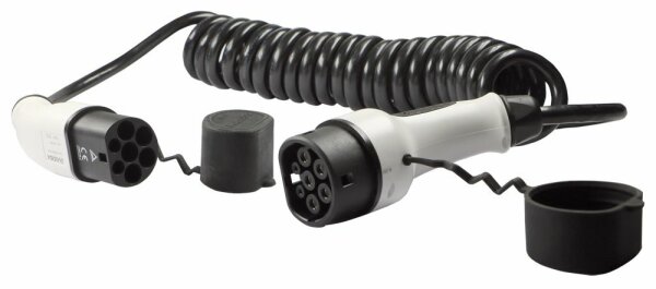 Mode 3 Spiral-Ladekabel für Elektro-Fahrzeuge mit Typ 2 Steckdose. Sehr robustes, flammwidriges Spiral-Kabel mit Typ 2-Stecker und -Kupplung (Stecker und Kupplung geschraubt). Die Ladung erfolgt 1-phasig oder 3 Phasig (230 / 400 V). für Mode 3 Ladestationen Typ 2 --> Typ 2