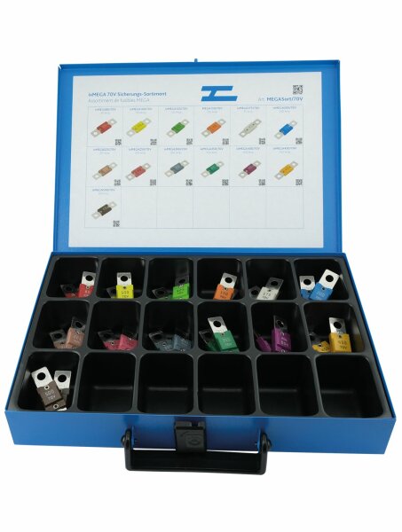 Inhalt: - je 2 x 80 A, 100 A, 125 A, 150 A, 175 A, 200 A, 225 A, 250 A, 300 A, 350 A, 400 A, 450 A, 500 A MEGA-Sicherungen 70 V 26 Sicherungen von 80 - 500 A