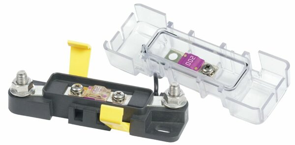 Sicherungshalter für MIDI- Sicherungen, mit transparenter Kunststoff-Abdeckung als Schutz vor Berührung und Feuchtigkeit, Schutzart IP66. Zum Austausch der Sicherung ist kein Lösen der Anschlussleitungen erforderlich. - die Abdeckung ist gegen Verlust gesichert, im Deckel ist Platz für eine Ersatzsicherung - der Deckel kann für den Kabelanschluss nach 3 Seiten hin ausgebrochen werden - für MIDI Sicherungen M5 von 30 A bis max. 200 A - Anschlussbolzen M8 (bis 70 mm2) - Maximale Spannung: 32V DC für MIDI 2x M5 Bolzen