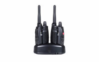 Technologisch auf dem höchsten Stand, ist das Funkgerät gleichermaßen geeignet für professionelle Anwender, die mit den Kollegen auf Baustellen, in Gebäuden, Hotels, auf Messen und Veranstaltungen Kontakt halten müssen, wie auch für den Freizeitbereich unter Freunden und in der Familie. Besonders hervorzuheben ist der VibraCall Alarm, mit dem Sie auch in lauter Umgebung keinen Anruf verpassen, sowie die lange Betriebsbereitschaft bei Verwendung vom automatischen Stromsparmodus (50 % Stromersparnis). Ebenfalls verfügt es über ein gut ablesbares LCD- Display mit Hintergrundbeleuchtung und einer einfachen Bedienung durch zentral angebrachte Bedienknöpfe.