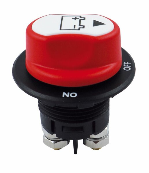 Schalterform: Drehschalter Funktion mechanisch: rastend Funktion elektrisch: Schliesser Spannung: 6 bis 32 Volt Belastbarkeit: 100 Ampère Einbauloch: rund Länge: 56 mm Breite / Tiefe: Blende ø45mm, Knopf ø35mm, Bohrloch ø29mm mm Höhe: 56mm (total) Eingebaut 37mm mm Durchmesser: 29 mm Beleuchtung: Nein Wasserdicht: Nein Zusatzinformation: - 0 - 1 - ø45 x 56mm (Bohrloch ø29), Einbau tiefe 37mm, Paneldicke max. 10mm - 100A, kurzfristig 150A - M6 Bolzen ø 45 x 56mm, max. 100A/32V