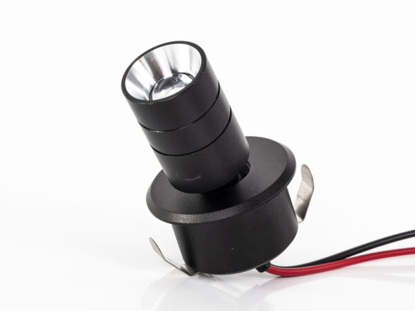 Projecteur encastré LED orientable avec support de serrage. Boîtier en métal laqué noir mat.12V / 0.4WDiamètre extérieur : 35 mmTrou : 30 mmClasse d'efficacité énergétique : G< /p>