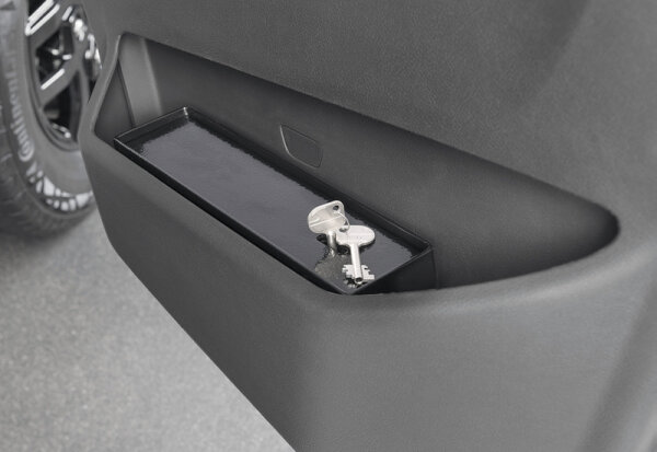 Eigens entwickelt für die Beifahrertür des Ford Transit ab Baujahr 06/2019. Der Safe wird mit einer zu verschaubenden Montageplatte im Türfach montiert und ist von Außen nicht zu erkennen. Der Deckel ist vor dem Aufhebeln geschützt, da keine Ansatzpunkte vorhanden sind. Der Safe ist ausgestattet mit einem 3-Bolzenschloss mit 7 Zuhaltungen.Weitere Spezifikationen:Außenmaße: B 275 mm / H 70 mm / T 165 mm (Tiefe der Tresore ist immer gegenüber der Tür)Innenmaße: H 270 mm x 65 mmInnenmaß Fahrzeugtür unten: T 165 mmInnenmaß Fahrzeugtür oben: T 105 mmTürdurchgangsmaße: B 245 mm / H 50 mm