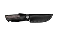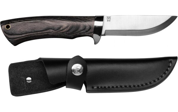 Das Tuv-Taschenmesser ist ein robustes Tuv-Messer, das für alles verwendet werden kann, vom Nageln von Fliesen bis zum Kochen. Die relativ kurze Messerklinge ist aus hochwertigem Stahl geschliffen. Der massive Griff aus grauem Pakkaholz ist so geformt, dass er angenehm in der Hand liegt. Das Messer verfügt über einen Fingerstopper, der dafür sorgt, dass Sie sich nicht schneiden, und ist in einer robusten schwarzen Lederscheide untergebracht