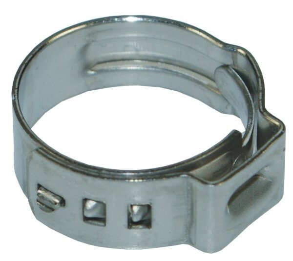 Stufenlose 1-Ohr-Klemmen (Oetiker Bride): ø6.8-8.0mm (Klemm-Durchmesser); 5mm (Bandbreite), 4mm (Ohrbreite); 0.5mm (Bandstärke) Edelstahl rostfrei Edelstahl (rostfrei)