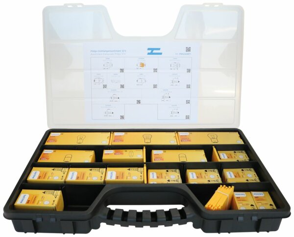 10 Stk. 12972PR (H7 12 V 55W Premium +30%) 10 Stk. 12844 (Soffitten. 12 V 5W 11x36) 10 Stk. 12821 (12 V 5W BA15s) 10 Stk. 12814 (12 V 10W BA15s) 10 Stk. 12499 (12 V 21/5W BAY 15d) 10 Stk. 12498 (12 V 21W BA15s) 10 Stk. 12496NA (12 V 21w Gelb BAU15s) 4 Stk. 12342PR (H4 12 V 60/55W Premium+30) 1 Stk. 1000624 Sortimentsschachtel die meistverkauften Glp. in einem Set