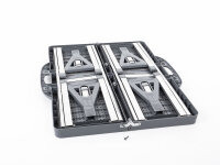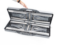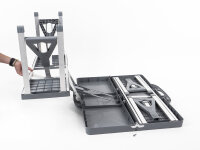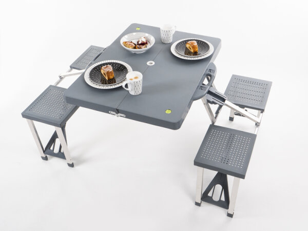 The picnic table is assembled in a flash and has 4 permanently installed seats, each of which can be loaded up to max. 60kg. The table is folded in the middle to a case with a practical carrying handle and is therefore easy to transport. The table has an umbrella hole in the middle - for rain or parasol...Table top: plastic (PP) / frame: aluminumDimensions: W 65 x L 85 x H 67cmPacking size: 65 x 85 x 11cmColor: grayWeight: approx. 6.5kg