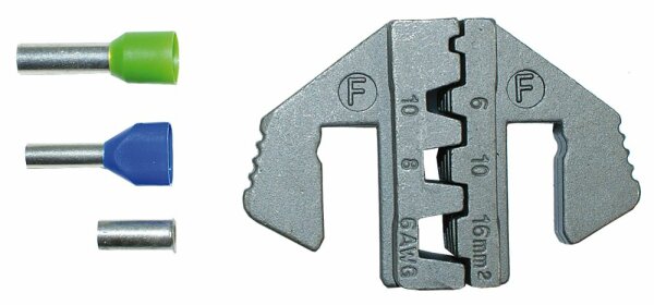 1 Satz Schnellwechsel-Pressformen Typ F für für isolierte Aderendhülsen (mittel) für die Rätschen-Presszange GL0601/PZ. 6.0/10.0/16.0mm2 6.0mm2 / 10AWG 10.0mm2 / 8AWG 16.0mm2 / 6AWG passend für die Presszangen aus den Sets: - GL0601 - ELDH6H7 - WN2701 passend zu Presszange GL0601/PZ