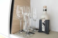 Zusammen mit der Noppenplatte ist der Stielglashalter IVY nutzbar für jegliche Schubladen, Staufächer, Aufbewahrungsboxen, dem Apothekerschrank u.v.m., in dem die Gläser hochkant transportiert werden können.