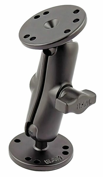 RAM Mounts Aufbau-Set basierend auf dem B-Kugel-System. Das Set kann auf nahezu allen vertikalen wie horizontalen Oberflächen befestigt werden. Im Einzelnen besteht das Set aus zwei runden Basisplatten und einem mittleren Verbindungsarm. Die runden Basisplatten besitzen zwei Lochraster - AMPS 4-Loch sowie 120° 3-Loch. Das AMPS-Lochraster ist passend für viele RAM Mounts Geräte-Halteschalen. Das patentierte Kugel-Arm-System sorgt für enorme Flexibilität und macht die RAM Mounts Halterungen zu einem unverzichtbaren Begleiter in zahlreichen Anwendungsgebieten. Die Gewichtskapazitäten basieren auf normalen Anwendungs-Umgebungen. B-Kugel (1 Zoll bis 0.9 kg) 2 x runde Basisplatten (AMPS), mittlerer Verbindungsarm