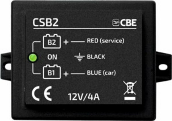 La batterie de démarrage est chargée par la batterie d'alimentation lorsque la tension est supérieure à 13,6 volts et continue jusqu'à ce que la tension dans la batterie d'alimentation soit inférieure à 12,5 volts. La tension de charge maximale est de 4 ampères. Indication de fonctionnement par LED. Avantage : La batterie de démarrage est rechargée par un système solaire ou un chargeur. Il n'y a pas de perte d'énergie.