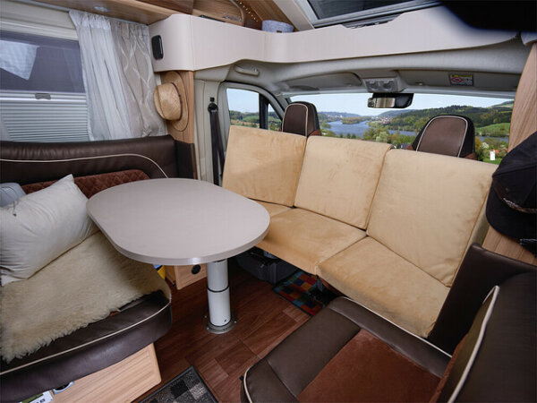 Relax Sofa Bank. Universal passende Bankauflage für die Vordersitze Ihres Reisemobils, passend für alle Fahrzeuge auf den Fahrgestellen von Fiat Ducato, MB Sprinter, Ford Transit und MAN TGE / VW Crafter. Mit nur wenigen Handgriffen gestalten Sie die entgegen der Fahrtrichhtung gedrehten Vordersitze in eine bequeme Relax-Oase zum Lesen, oder gemütlichem Sitzen. Ein zusätzlich gewonnener Sitzplatz bietet Platz für Gäste. Der kuschelweiche Velours-Stoff ist samtweich und hauptsympathisch. Er ist ohne großen Aufwand abnehm- und waschbar.