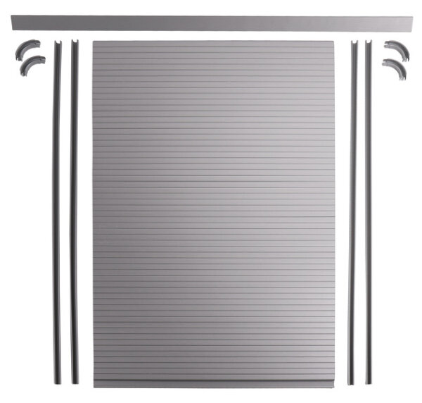 • Komplett mit zuschneidbarem Rollladen, Schienen und Blende