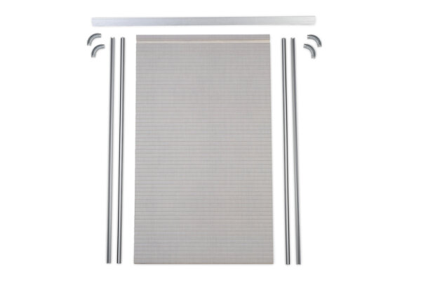 • Komplett mit zuschneidbarem Rollladen, Schienen und Blende