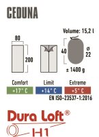 La housse extérieure est traitée avec le BIONIC-FINISH®ECO sans PFC. Ce traitement écologique et durable est résistant à la saleté et à l'eau. Le Ceduna est un sac de couchage confortable avec une grande liberté de mouvement. Il est parfaitement adapté au camping, aux festivals et aux visites chez des amis. Le garnissage haut de gamme en fibres synthétiques Dura Loft® H1 a une excellente performance thermique. Les fibres creuses sont indéchirables et siliconées pour garantir une bonne compressibilité et un bon gonflant. La housse extérieure est agréablement douce et résistante. La doublure intérieure est composée d'un matériau respirant et doux pour la peau.