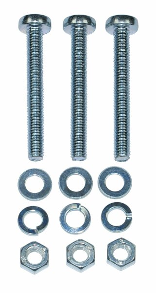 Inhalt: 3 Schrauben Kreuzschlitz M5 x 40mm 3 Muttern M5 3 Federringe M5 3 Unterlagscheiben M5 3 Schrauben/Muttern/Federringe/Unterlagsch.