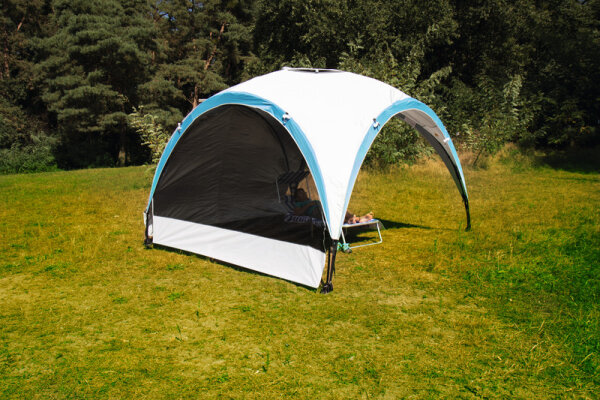 Zwei Seitenwände mit Moskitonetz zum Schutz vor Motten und Mücken zum einfachen und schnellen ein- oder aushängen. Bei Nichtbenutzung läßt sich die Seitenwand in den praktischen Taschen am Zeltpavillion aufbewahren.