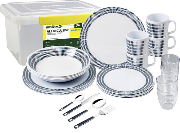 Contient: 4 assiettes plates, 4 assiettes à soupe, 4 assiettes à dessert, 4 tasses à anse, 300 ml, 4 verres, 200 ml, 16 pcs. de couverts
