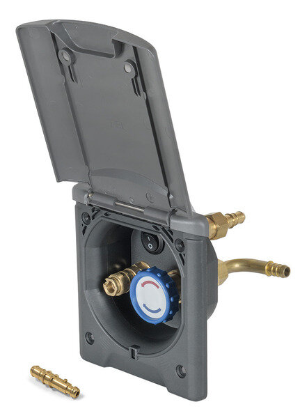 Außendusche mit Klappdeckel, Schlauchtülle gewinkelt und gerade, sowie Stecknippel für Duschschlauchanschluss. Regelung der Wassertemperatur erfolgt über den Drehregler.