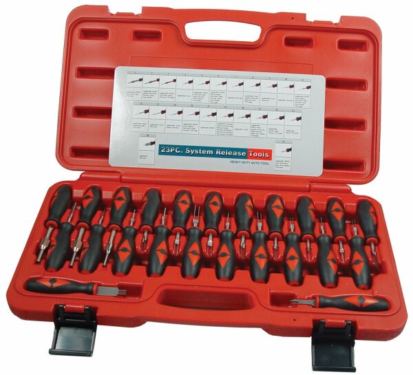 Koffer-Set mit 23 Ausstosswerkzeugen (AW01, AW02...AW23) - Für die beschädigungsfreie Entriegelung von fahrzeugspezifischen & universellen Steckern (zB Superseal). Passend für Stecker der folgenden Marken: Audi, BMW, Chrysler, Citroen, Fiat, Ford, Honda, Jaguar, Mazda, Mercedes, Mitsubishi, Opel, Renault, Porsche, Saab, Seat, Skoda, Toyota, VW 23 Ausstoss- und Entriegelungswerkzeuge