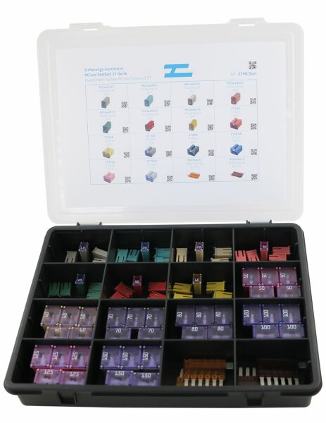 - Je 5 Sicherungen Typ MCase Slotted von 15 - 60 A für Ford, Renault, Nissan - Je 5 Sicherungen Typ ET von 50 - 150 A für Mazda und Toyota - Je 2 Sicherungen Multiato 5 A und 7.5 A für Mercedes MCase Slotted 15-60 A, ET 50-150 A, Multiato