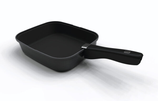 Pfanne in quadratischer Form für maximale Kochfläche, aber minimale Oberfläche. Der revolutionäre Griff wird mit einfachem Knopfdruck entfernt oder angebracht. Fassungsvermögen 2,9 l