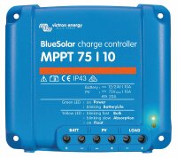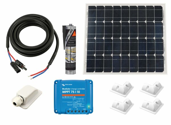 Besteht aus: - 1 x Solarpanel 55 W (ohne Kabel) - 4 x Eckhalterungen - 1 x Dachdurchführungstülle 1-fach - 1 x Laderegler max. 75 V 10 A - 1 x Sikaflex 552 sz Dicht- und Klebemasse - 1 x 5 m Solarkabel 2x 4.0 mm2 mit MC4 Steckern (müssen abgeschnitten werden) - die erhöhten Verpackungskosten sind im Artikelpreis enthalten - um 24 V Batterien laden zu können, muss ein identisches Modul (SP55) in Serie geschaltet werden Komplett-Set mit Solarpanel, Laderegler etc.